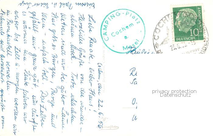 73838860 alte Postkarte Cochem Kochem Mosel Fliegeraufnahme mit Burg und Campingplatz postalisch gelaufen Erhaltung siehe scans [WerneD78] KatCode: 11110007135020