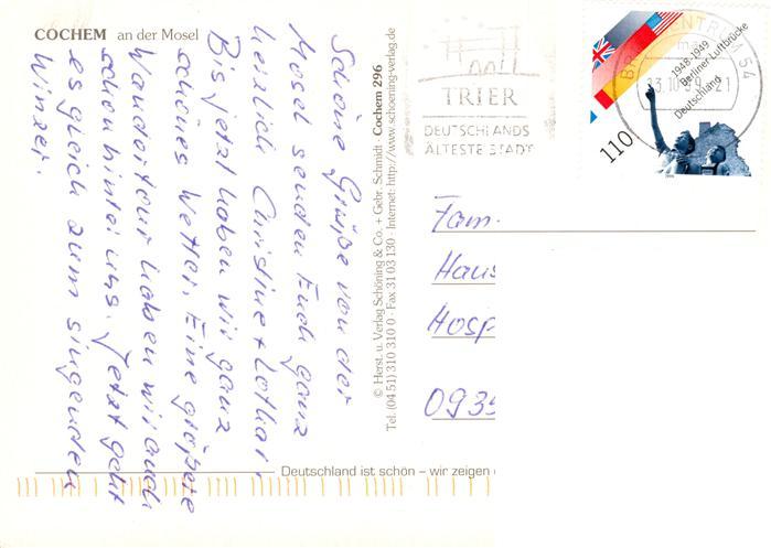 73945069 alte Postkarte Cochem Kochem Mosel Teilansichten Altstadt Fachwerkhaeuser Promenade Parkanlagen Reichsburg postalisch gelaufen Erhaltung siehe scans [FriedD77] KatCode: 11110007135020