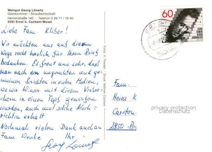 73843611 alte Postkarte Cochem Kochem Mosel Weingut Georg Loenartz Probierstube Weinkeller postalisch gelaufen Erhaltung siehe scans [WerneD78] KatCode: 11110007135020