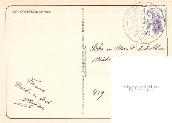 72942825 alte Postkarte Cochem Mosel Altstadt Fussgaengerzone Brunnen Uferpromenade Reichsburg postalisch gelaufen Erhaltung siehe scans [FriedD77] KatCode: 11110007135020