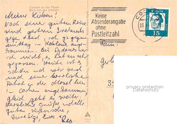 72867295 alte Postkarte Cochem Mosel Blick von der Umkehr postalisch gelaufen Erhaltung siehe scans [NatalD47] KatCode: 11110007135020