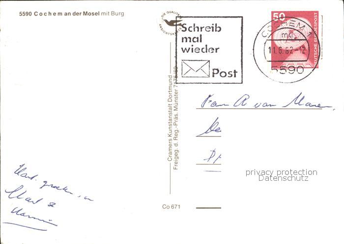 72412452 alte Postkarte Cochem Mosel Burg Ortsansicht postalisch gelaufen Erhaltung siehe scans KatCode: 11110007135020