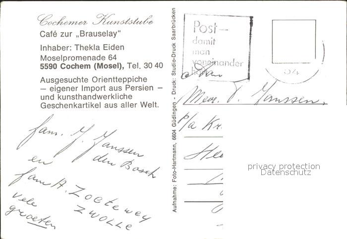71901860 alte Postkarte Cochem Mosel Cochemer Kunststube Cafe Zur Brauselay postalisch gelaufen Erhaltung siehe scans KatCode: 11110007135020