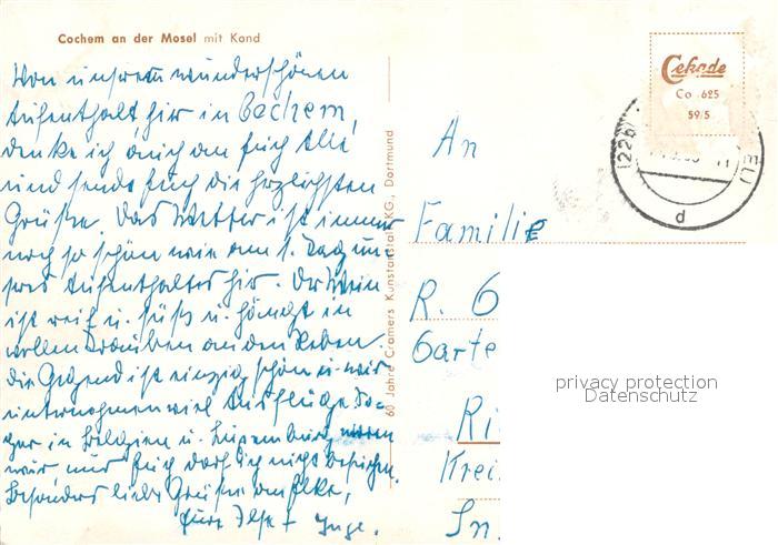 73662191 alte Postkarte Cochem Mosel Fliegeraufnahme mit Kand postalisch gelaufen Erhaltung siehe scans [LiesaD40] KatCode: 11110007135020