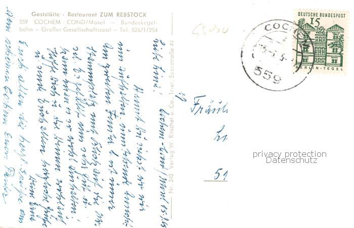 73792889 alte Postkarte Cochem Mosel Gaststaette Zum Rebstock Aussenansicht m. Terrasse postalisch gelaufen Erhaltung siehe scans [LiesaD40] KatCode: 11110007135020