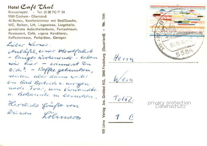 73615845 alte Postkarte Cochem Mosel Hotel Cafe Thul Restaurant Cafe postalisch gelaufen Erhaltung siehe scans [WerneD78] KatCode: 11110007135020