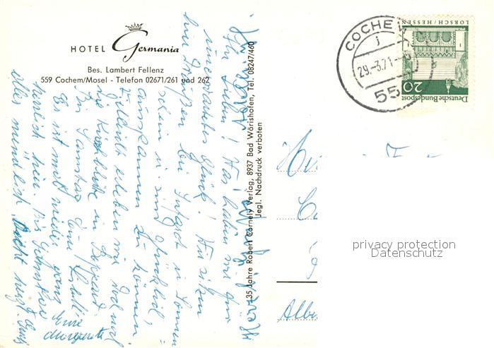 73608749 alte Postkarte Cochem Mosel Hotel Germania Terrasse postalisch gelaufen Erhaltung siehe scans [WerneD78] KatCode: 11110007135020