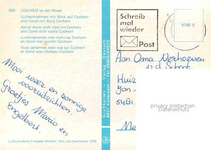 72856037 alte Postkarte Cochem Mosel Luftaufnahmen mit Blick auf Cochem und Cond mit Burg Cochem postalisch gelaufen Erhaltung siehe scans [FriedD77] KatCode: 11110007135020