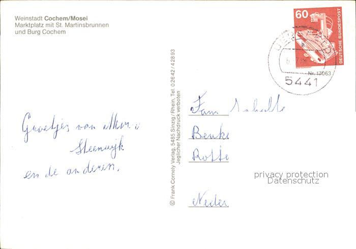 72420944 alte Postkarte Cochem Mosel Marktplatz mit St Martinsbrunnen Burg Cochem postalisch gelaufen Erhaltung siehe scans KatCode: 11110007135020