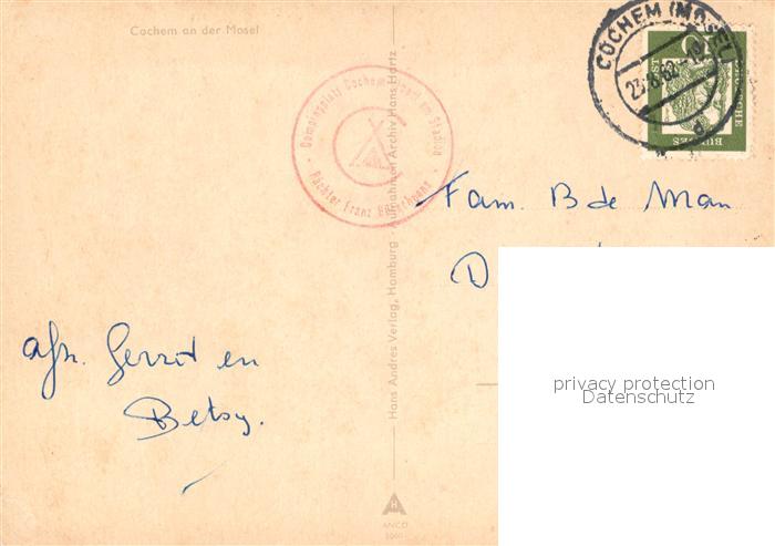 73311793 alte Postkarte Cochem Mosel Moselpartie postalisch gelaufen Erhaltung siehe scans [LiesaD40] KatCode: 11110007135020