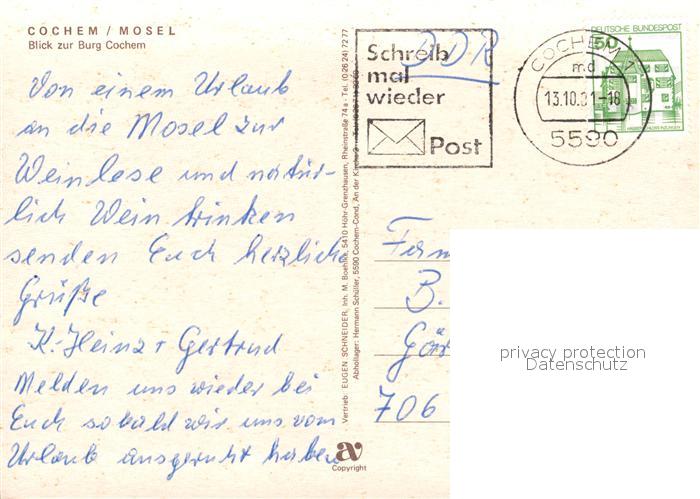 73606353 alte Postkarte Cochem Mosel Moselpartie mit Burg postalisch gelaufen Erhaltung siehe scans [LiesaD40] KatCode: 11110007135020