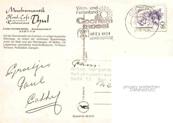 72899100 alte Postkarte Cochem Mosel Moselromantik Hotel Thul Terrasse Gastraeume postalisch gelaufen Erhaltung siehe scans [FriedD77] KatCode: 11110007135020