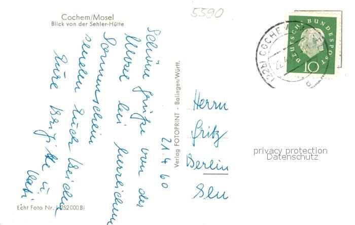 73560653 alte Postkarte Cochem Mosel Panorama Blick von der Sehler Huette postalisch gelaufen Erhaltung siehe scans [KathaD81] KatCode: 11110007135020