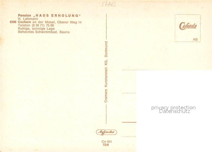 73651950 Cochem Mosel Pension Haus Erholung Gaststube Terrasse Hallenbad postalisch nicht gelaufen Erhaltung siehe scans [WerneD78] KatCode: 11110007135020