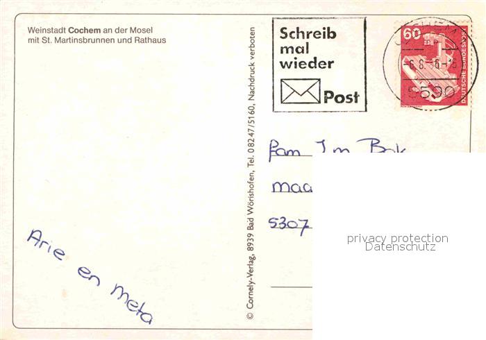 72653679 alte Postkarte Cochem Mosel St. Martinsbrunnen und Rathaus postalisch gelaufen Erhaltung siehe scans [LiesaD40] KatCode: 11110007135020
