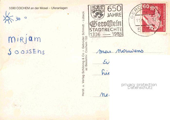 72855848 alte Postkarte Cochem Mosel Uferanlagen Faehre Bruecke postalisch gelaufen Erhaltung siehe scans [FriedD77] KatCode: 11110007135020