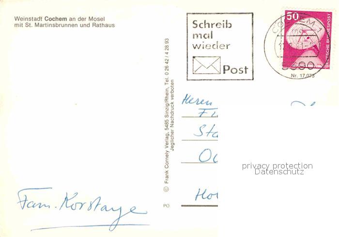 72653745 alte Postkarte Cochem Mosel Weinstadt mit St. Martinsbrunnen und Rathaus postalisch gelaufen Erhaltung siehe scans [LiesaD40] KatCode: 11110007135020