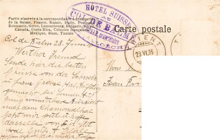 13921791 alte Postkarte Col de Balme 2204m VS et l’Aiguille Verte postalisch gelaufen Erhaltung siehe scans [FriedD77] KatCode: 11470500405580