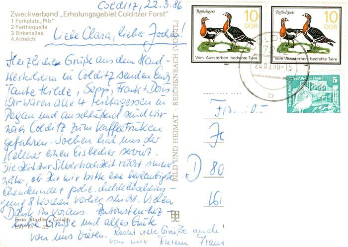 73908696 alte Postkarte Colditz Erholungsgebiet Colditzer Forst Parkplatz Pilz Parthequelle Birkenallee Altteich postalisch gelaufen Erhaltung siehe scans [WerneD78] KatCode: 11110014383070