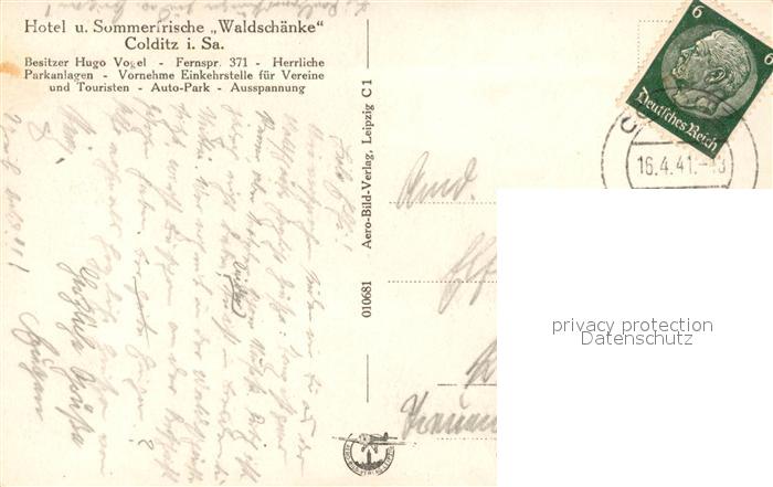 43292083 alte Postkarte Colditz Hotel Sommerfrische Waldschaenke postalisch gelaufen Erhaltung siehe scans [KathaD81] KatCode: 11110014383070