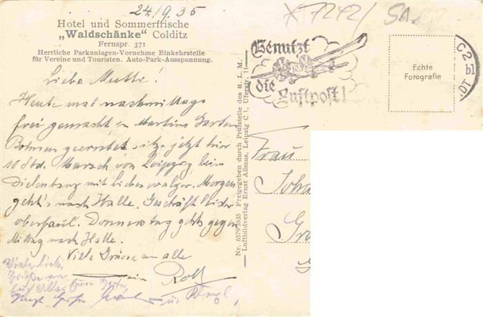 73975422 alte Postkarte Colditz Sachsen Waldschaenke Colditz postalisch gelaufen Fliegeraufnahme Erhaltung siehe scans [FriedD77] KatCode: 11110014383070