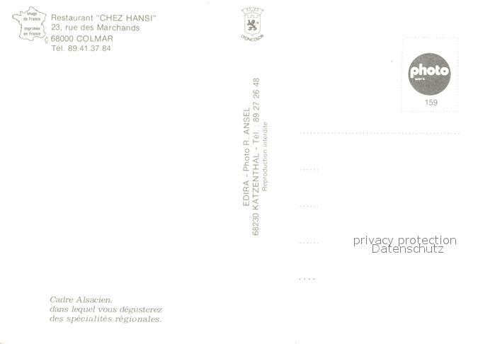 12935426 Colmar Haut Rhin Elsass Restaurant Chez Hansi postalisch nicht gelaufen Erhaltung siehe scans [WerneD78] KatCode: 11170068268066