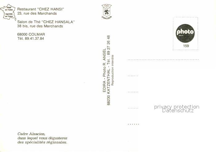 12926047 Colmar Haut Rhin Elsass Restaurant Chez Hansi Salon de The Chez Hansala postalisch nicht gelaufen Erhaltung siehe scans [WerneD78] KatCode: 11170068268066
