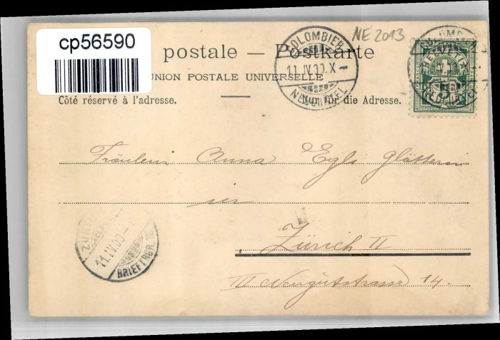 10719840 alte Postkarte Colombier NE Schloss postalisch gelaufen KatCode: 11470130405068