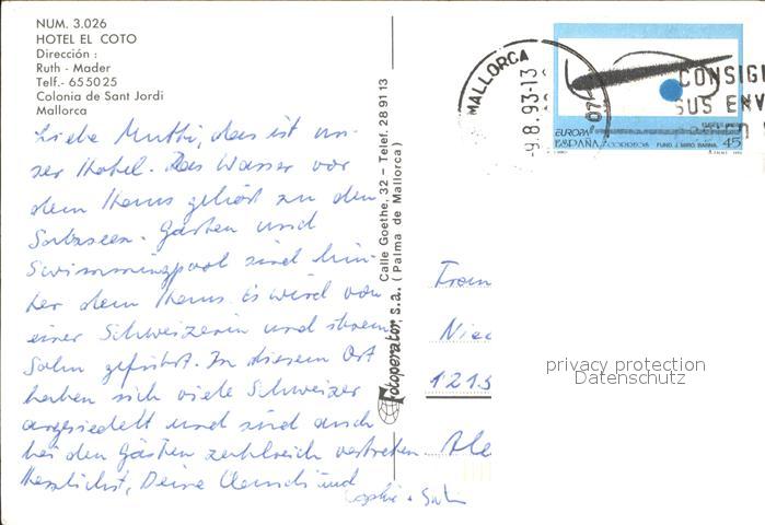 old postcard Colonia de Sant Jordi Hotel El Coto postalisch gelaufen Erhaltung siehe scans