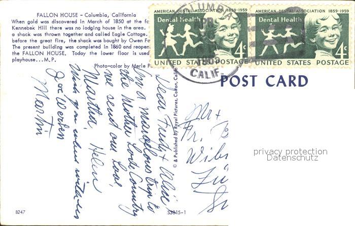 11688520 old postcard Columbia California Fallon House Kennebek Hill postalisch gelaufen Erhaltung siehe scans KatCode: 14140050000000