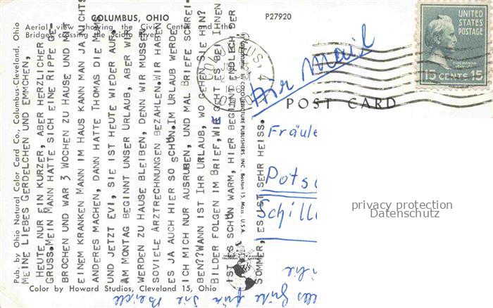 14104340 old postcard Columbus Ohio USA Civic Center Bridge crossing Scioto River aerial view postalisch gelaufen Fliegeraufnahme Erhaltung siehe scans [FriedD77] KatCode: 14140370000000