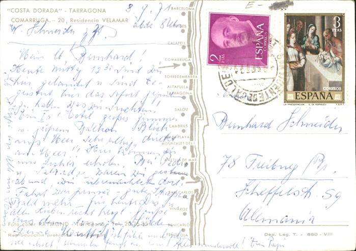 old postcard Comarruga Residencia Velamar Uferstrasse Strand postalisch gelaufen Erhaltung siehe scans