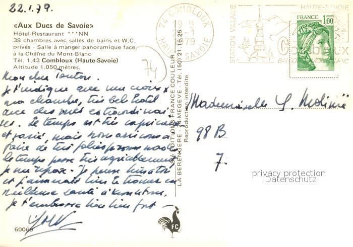 13169549 carte postale Combloux Hotel Restaurant Aux Ducs de Savoie en hiver postalisch gelaufen Erhaltung siehe scans [FriedD77] KatCode: 11170074274083