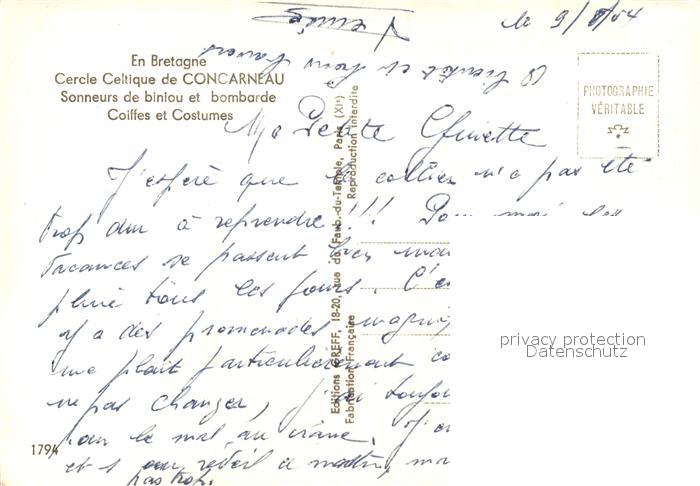 13581970 Concarneau Finistere Cercle Celtique Sonneurs de biniou et bombarde Coiffes et Costumes postalisch nicht gelaufen Erhaltung siehe scans [FriedD77] Frie Katcode 11170029429039