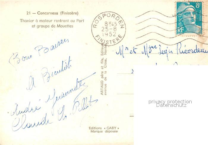 13581939 Concarneau Finistere Thonier a moteur rentrant au port Groupe de Mouettes postalisch gelaufen Erhaltung siehe scans [FriedD77] carte postale Frie Katcode 11170029429039