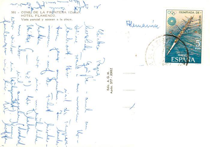 old postcard Conil de la Frontera Hotel Flamenco Vista parcial y acceao a la playa postalisch gelaufen Erhaltung siehe scans [WerneD78]