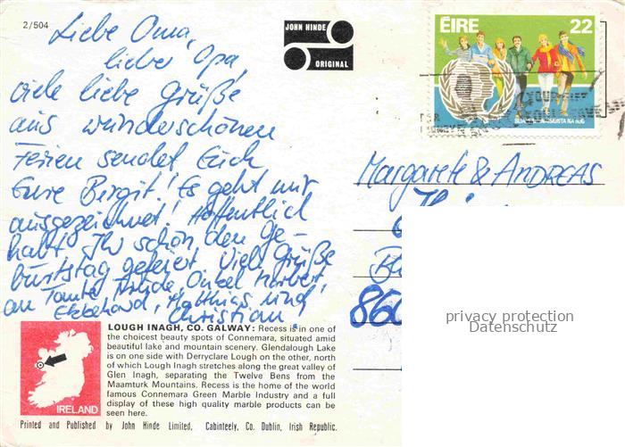74005741 old postcard Connemara Ireland Lough Inagh postalisch gelaufen Erhaltung siehe scans [FriedD77] KatCode: 11220