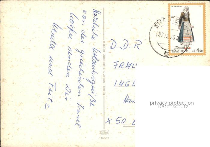 old postcard Corfou Fliegeraufnahme Kirche Trachtentraegerinnen Strand postalisch gelaufen Erhaltung siehe scans