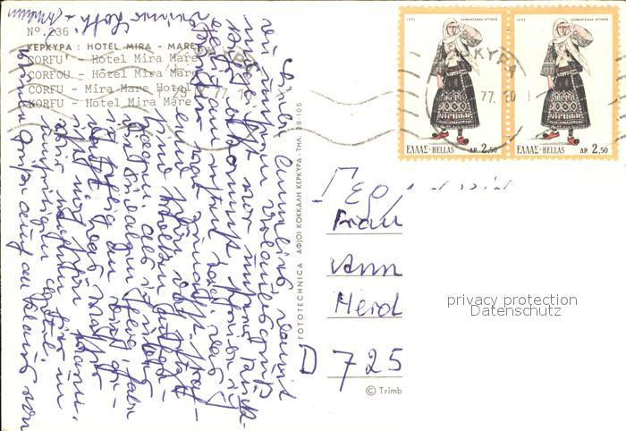 old postcard Corfou Hotel Mira Mare postalisch gelaufen Erhaltung siehe scans [LiesaD40]