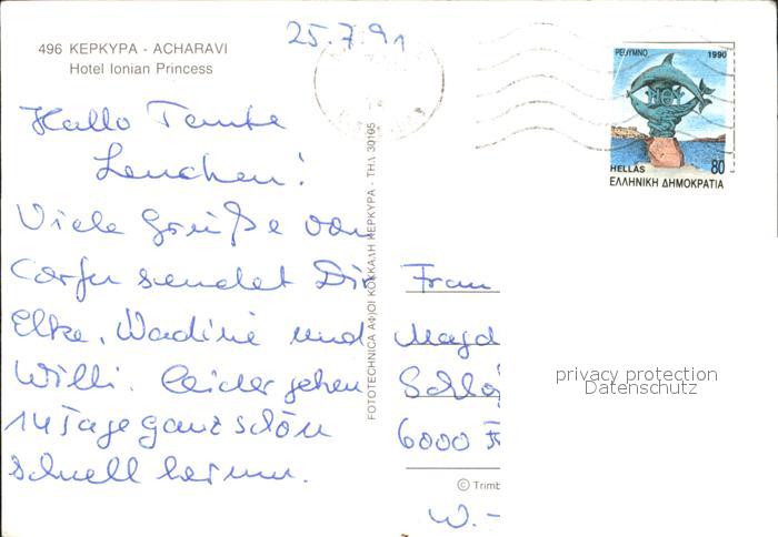 old postcard Corfu Korfu Acharavi Segelpartei Sonnenuntergang Strand Hotel Ionian Princess postalisch gelaufen Erhaltung siehe scans