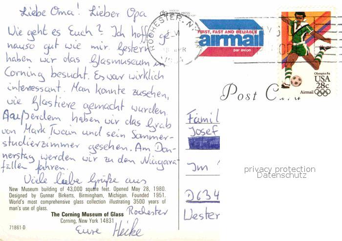72770172 old postcard Corning New York The Corning Museum of Glass postalisch gelaufen Erhaltung siehe scans [AndreD76] KatCode: 14140340000000