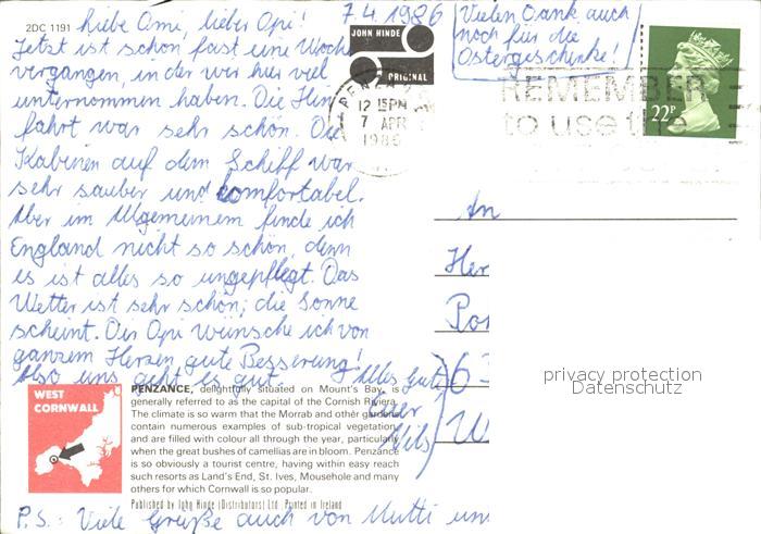 old postcard Cornwall Torpoint Penzance by night postalisch gelaufen Erhaltung siehe scans