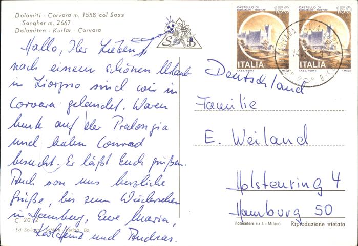 old postcard Corvara Pustertal Suedtirol Panorama mit Dolomiten postalisch gelaufen Erhaltung siehe scans