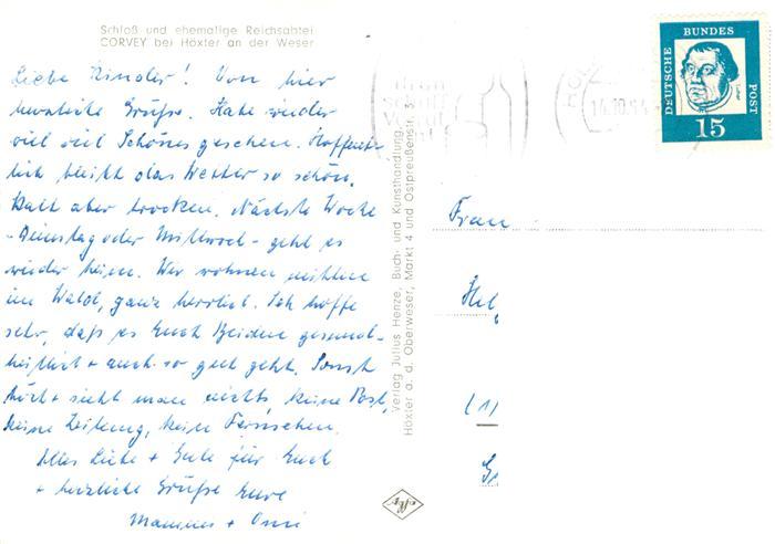 73941694 Corvey Hoexter Weser Schloss und ehemalige Reichsabtei postalisch gelaufen Fliegeraufnahme Erhaltung siehe scans [FriedD77] Fliegeraufnahme alte Postkarte Frie Katcode 11110005762020