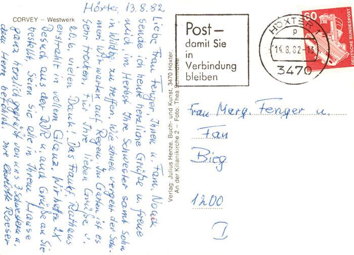 73945086 Corvey Hoexter Weser Westwerk Kirche postalisch gelaufen Erhaltung siehe scans [FriedD77] alte Postkarte Frie Katcode 11110005762020