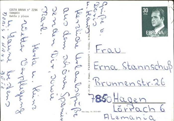 old postcard Costa Brava Tamariu Schiff postalisch gelaufen