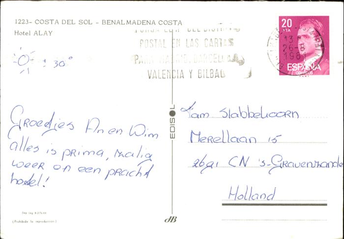 old postcard Costa Del Sol Hotel Alay postalisch gelaufen