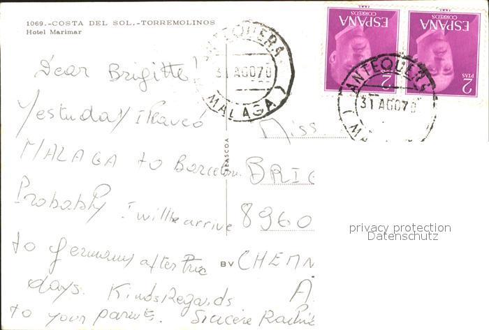 old postcard Costa Del Sol Torremolinos Hotel Marimar postalisch gelaufen Erhaltung siehe scans