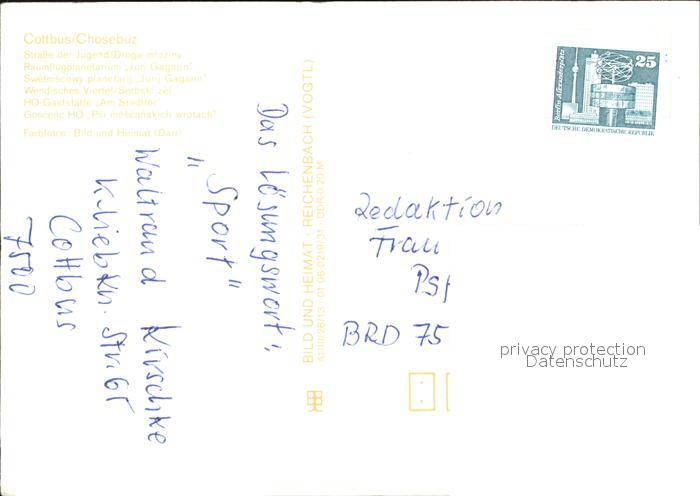 72459733 alte Postkarte Cottbus Strasse der Jugend Raumflugplanetarium Juri Gagarin Wendisches Viertel HO Gaststaette postalisch gelaufen Erhaltung siehe scans KatCode: 11110012052000