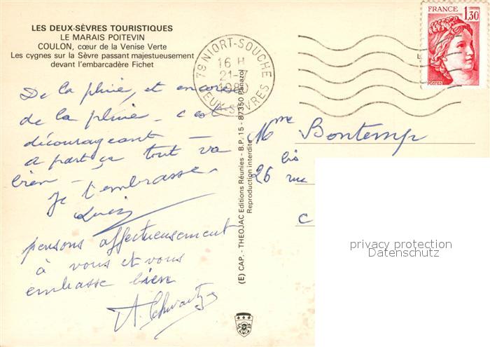 13582596 Coulon Les cygnes sur la Sevre passant majestueusement devant l’ambarcadere Fichet postalisch gelaufen Erhaltung siehe scans [WerneD78] carte postale Wern Katcode 11170079279100